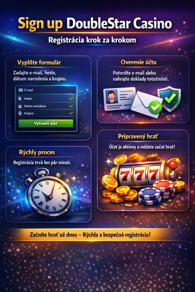 Proces Sign up v DoubleStar Casino je navrhnutý tak, aby bol jednoduchý a rýchly. Hráči vyplnia registračný formulár, doplnia povinné údaje a potvrdia vytvorenie účtu. Po dokončení je účet pripravený na používanie a prístup k hlavným funkciám platformy.